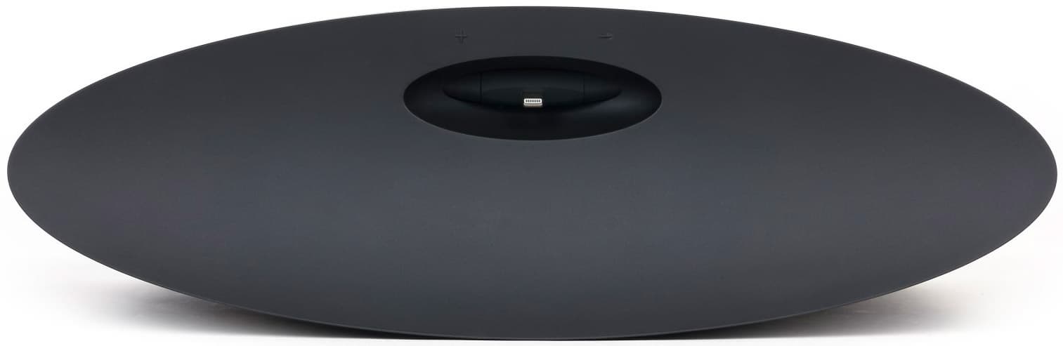 Пластиковые части аудиосистемы имеют покрытие софт-тач, следов от пальцев на котором почти не остается. По центру корпуса расположена, собственно, сама док-станция. «Папа» Lightning установлен так, что допускает небольшой люфт по вертикали. Углубление, в котором он размещен, может вместить лишь iPhone или iPod — для планшета места уже не хватит. Это, конечно же, сильно ограничивает функциональность устройства, ведь в домашних условиях, на которые рассчитана аудиосистема, куда приятней использовать iPad.