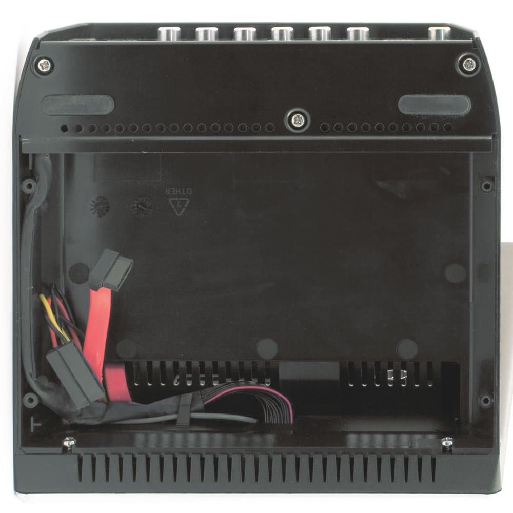 В плеер можно установить SATA жесткий диск формата 3,5'' и объемом до 1,5 ТБ. Для этого крепим его на нижнюю металлическую крышку, подключаем кабели и потом всю это конструкцию пытаемся установить на место. Обратите внимание, что активного охлаждения винчестера не предусмотрено, так что желательно выбирать холодные модели. По-сути, встроенный диск необходим только для работы торрент-клиента или просмотра высокобитрейтных записей. Так что без него можно и обойтись, если домашняя сеть не нуждается в постоянно работающем сетевом хранилище.