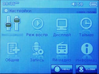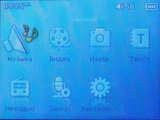 Главное меню представляет собой набор иконок, двойной клик по которым запускает соответствующую функцию: Музыка, Видео, Изображения, Текст, FM-радио, Запись, Настройки. Надо сказать, русификация выполнена вполне достойно, хотя присутствуют некоторые огрехи (например, некоторые пункты не переведены).