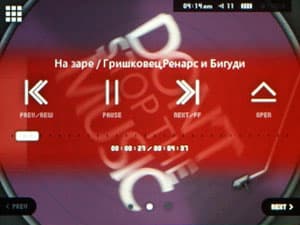 Нажатие на экран вызывает панель с кнопками, а также прогресс-бар: нажав в любом его месте, можно сразу оказаться в соответствующем месте трека. Кнопки такие: Play/Pause, для переключения треков вперед/назад, а также кнопка для открытия музыки. И вот здесь начинается самое интересное. Нажав сначала на экран, затем на эту всплывающую кнопку открытия музыки, вы попадаете в список песен, открытый вами последним. Но чтобы переместиться наверх по иерархии файлов, необходимо нажать в правом верхнем углу небольшую пиктограмму с изображением облачка-диалога (что уже довольно странно). Затем внизу отобразится кнопка «Вверх», только нажав которую, вы сможете открыть остальную библиотеку музыки. Иначе говоря, необходимо нажать 3 раза в разных местах дисплея, что не логично. При этом левый верхний угол при воспроизведении занимает пиктограмма браузера музыки, основанного на отображении обложек альбомов.