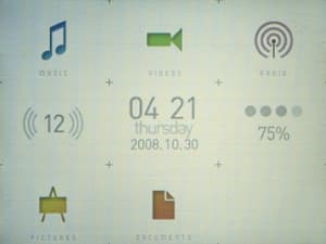Здесь стоит упомянуть об изменениях в интерфейсе. Если ранее под палец было «заточено» только главное меню, которое было представлено традиционными квадратными иконками, то теперь это многооконное меню, пролистываемое пальцем. В одном окне — музыка, видео, радио, картинки и текстовый просмотрщик, в другом — браузер файлов, флеш-плеер, диктофон, вызов настроек, в третьем — разные бонусные функции, представленные в данной модели секундомером, калькулятором, записными книжками — одна рукописная, другая — с виртуальной QWERTY-клавиатурой. И на последнем, четвертом экране можно быстро сменить ориентацию дисплея, яркость (от 1 до 10), тему оформления (их всего две), отправить плеер в спящий режим (это можно сделать и механической кнопкой). Помимо главного экрана, на управление пальцем стали ориентированы и все остальные функции плеера.