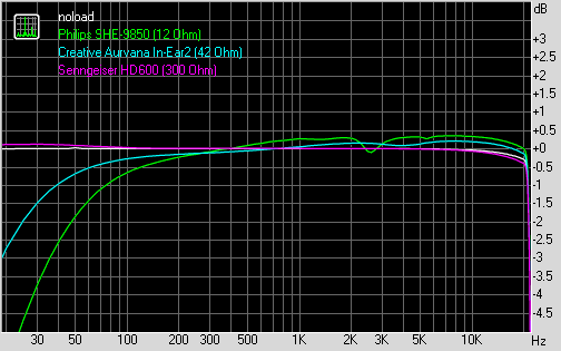 Кроме того, мы провели измерения, подключив реальные наушники. Были использованы следующие модели: Sennheiser HD600 (300 Ом), арматурные Philips SHE-9850 (12 Ом), арматурные Creative Aurvana In-Ear2 (42 Ом).