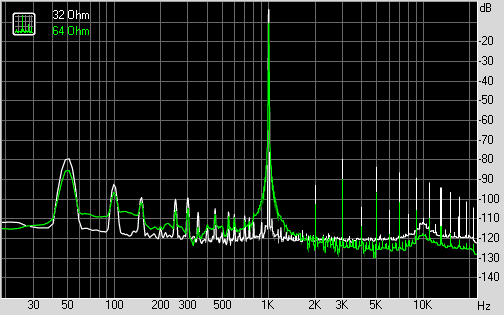 График гармонических искажений под нагрузкой 32 и 64 Ом: