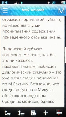 Плеер умеет открывать файлы формата TXT. Просмотрщик обладает кучей настроек. Можно изменять размер шрифта при помощи «мультитача» — двумя пальцами сужать или раздвигать, соответственно изменяется и размер шрифта. Можно сделать это же самое и при помощи ползунка на экране. Имеется автопрокрутка — текст на экране сменяется с заданной периодичностью. Фон текста и цвет шрифта тоже подвергаются настройке, среди представленных «наборов» есть вполне удобоваримые. И последнее, что можно сказать — текст можно разворачивать на весь экран, чтобы ненужная информация не занимала много места.