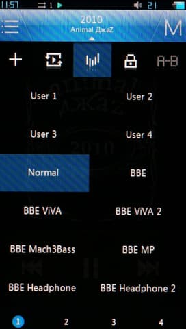Звучание плеера производит очень приятное впечатление со всеми вышеназванными наушниками. Как с низкоомными, так и с «обычными» наушниками звучание плеера очень ровное, искажения практически не слышны. Огрехи АЧХ наушников можно подправить с помощью очень плавно настраиваемого эквалайзера. Жаль, что он всего 5-полосный, но зато предоставляет свободу действий, недоступную в прочих плеерах.