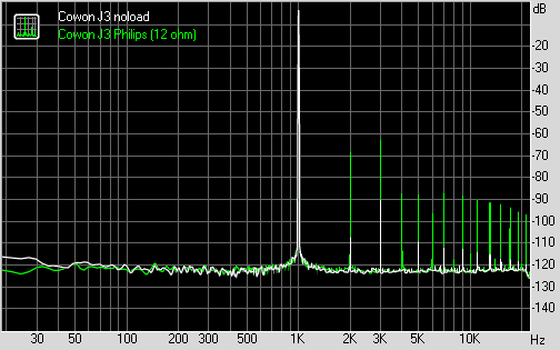 График искажений при подключении наушников Philips 9850 (12 Ом) и график для режима без нагрузки: