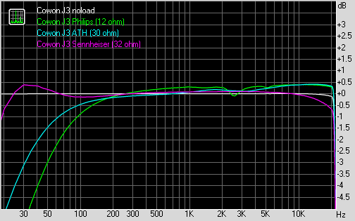 | Тест | Cowon J3 без нагрузки | Cowon J3 с наушниками Philips | Cowon J3 с наушниками ATH | Cowon J3 с наушниками Sennheiser |