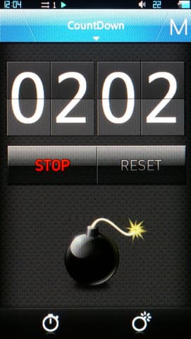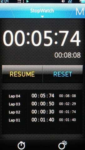 Под одной «крышей» собраны функции, так или иначе касающиеся хронометража. Это настройка часов, будильника, а также секундомер и таймер. Часы отображаются всегда в верхней строке, это удобно. Будильник — вполне полезная функция в данном плеере, учитывая наличие достаточно громкого динамика. На звонок можно поставить любую мелодию. И последнее — секундомер и таймер. Секундомер может делать засечки. Интересно, что после выключения записи в секундомере все равно сохраняются.