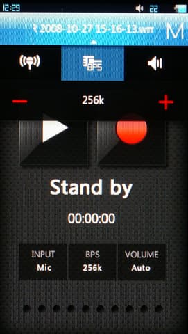 Диктофон в плеере записывает звук в формат WMA с битрейтом от 32 до 256 Кбит/с. Этого с головой хватает для качественной записи. Настраивается также громкость записи. Имеется возможность записи с линейного входа, вот только кабель для этого придется, опять же, докупить, он вставляется в USB-гнездо. Качество записи очень высокое, чувствительность микрофона на высоте. Это, с одной стороны, очень хорошо — если плеер лежит на столе, то он будет улавливать малейшие детали и записывать каждый шорох, но при этом не стоит трогать отверстие микрофона, иначе шум в наушниках будет зверско оглушающий.