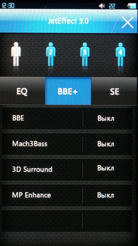 Далее идут обширные настройки эквалайзера. Есть возможность создать четыре собственные настройки. Каждая включает в себя пятиполосный эквалайзер и два улучшайзера. Все это может работать одновременно. Настройка очень удобна. Каждая полоса регулируется. Другими словами, вы можете задать нижний предел в 60 Гц, а можете — в 175. Плюс, регулируется ширина пропускания (на какую область частот будет распространяться ваша настройка). Улучшайзеры фирменные Cowon’’овские — BBE+ и SE (Stereo Enhance). Эти фирменные штуки — одни из тех, которыми иногда приятно пользоваться. В других плеерах «улучшайзеры» нравятся меньше, а у Cowon работают вполне интересно. Из комбинации «эквалайзер + BBE + SE» также составлено несколько десятков предустановок для разной музыки, можно создать и свои.