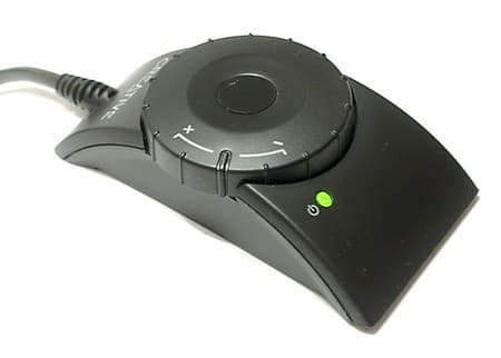 Пульт дистанционного управления в этом наборе выполнен проводным. Его дизайн выдержан в общем стиле набора. На пульте есть регулятор общей громкости и выключатель питания с индикатором.