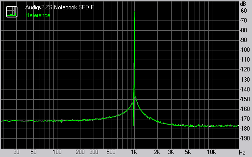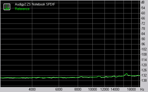 Параметр Сигнал/Шум заявлен как 104 дБ, при тестировании через профессиональный интерфейс E-MU1616m (118 дБА в собственном loop) получилось 102 дБА, это очень хороший результат для ноутбучной карты. Сам по себе параметр не говорит ничего о качестве звучания, но косвенно показывает, что начинка карты довольно близка к PCI линейке Audigy2, которые могут выдать (в конфигурации с качественным питанием) до 109 дБА. У встроенного звука Intel 82801 BA в данном ноутбуке в тех же условиях всего 63 дБА.