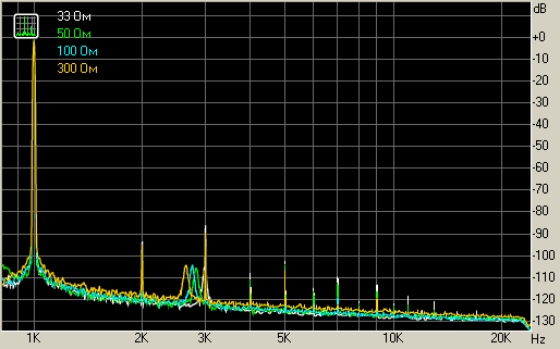 Важно то, что искажения в максимальных режимах усиления очень низки, никакой перегрузки нет. При использовании низкоомных нагрузок можно видеть лишь незначительный рост гармоник высоких порядков, при этом характер искажений благоприятный, т.к. их рост убывает в сторону увеличения порядка.