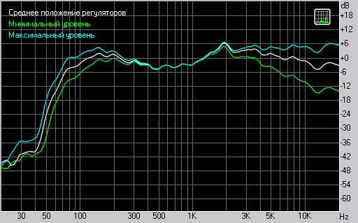 Здесь можно наглядно видеть реальную работу регуляторов тембра. Высокие частоты изменяются, начиная с 2 кГц, а регулятор BASS увеличивает громкость в области 80 Гц.
