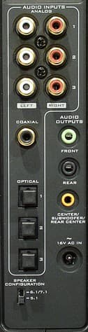 На задней панели декодера расположены разъемы для подключения и переключатель конфигурации колонок с 5.1 на 6.1/7.1 (в зависимости от подключаемой акустики). Декодер имеет три линейных входа c разъемами стерео RCA, цифровой коаксиальный вход и три оптических входа. Три оставшихся разъема миниджек служат для поключения дополнительного блока.