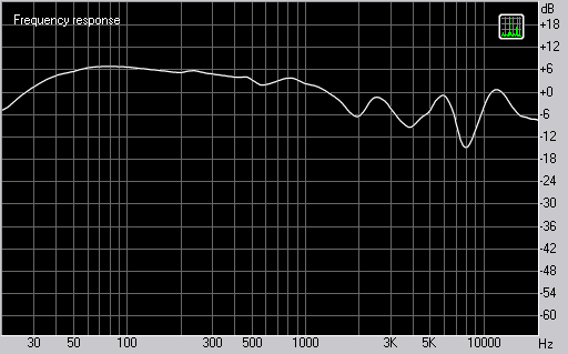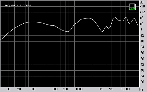 На измеренном графике АЧХ мы видим неравномерность, составляющую ± 8 дБ в диапазоне 30–20 000 Гц. На графике можно видеть три ярко выраженных подъема, на низких, средних и высоких частотах.