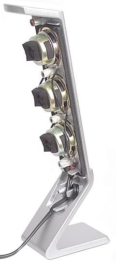 С левой стороны пульта расположены регулятор общей громкости, а также регулировка относительного уровня сабвуфера. Включение колонок реализовано на регуляторе общей громкости в его крайнем положении. Длина провода, соединяющего пульт ДУ и сабвуфер, составляет два с половиной метра. Для того, чтобы пульт не "болтался" на столе в комплект входят резиновые прокладочки с самоклеющейся поверхностью с обеих сторон. Это позволяет укрепить пульт ДУ на любой ровной поверхности.