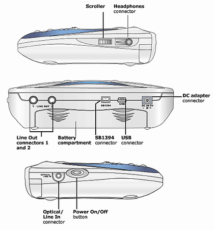 Для связи с внешним миром имеется новейший сверхскоростной интерфейс IEEE1394, но для более широкой совместимости оставлен и USB. Кроме того, для обладателей минидисковой аппаратуры предусмотрен цифровой оптический вход, а для стационарного использования линейный выход аж на две пары колонок. Ну а для того, чтобы работа была совсем уж комфортной, имеется ИК-пульт ДУ. Для работы с PC имеется удобный фирменный софт на все случаи жизни, а также регулярно обновляемые через Интернет прошивки. Существует также теоретическая возможность приобретать в он-лайне дополнительные аксессуары, вроде сменных корпусов, FM-тюнера или адаптера аудио-кассеты.