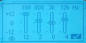 Зато в последней прошивке появился графический эквалайзер. Вещь однозначно рулезная. В приведённом на фото положении движков, несмотря на предельное значение ползунка настройки в низких частотах, звук не имеет никаких намёков на перегрузку.