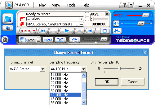 Последняя вкладка панели EAX — Time Scaling. Убыстрение и замедление звука. Качество, на мой взгляд, очень низкое… Работает только под Creative MediaSourse Player. А теперь о веселом — ставим по умолчанию звуковую карту Prodigy7.1, запускаем фирменный проигрыватель от Creative MediaSourse Player и музыку, включив настройки EAX. Эффекты реверберации EAX не работают. А вот CMSS, Clean-up, Караоке (Voice Suppression amount и Pitch) и Time Scaling под Prodigy7.1 исправно работает. Делаем вывод — Караоке (Voice Suppression amount и Pitch) и Time Scaling — программные плагины исключительно Creative MediaSourse Player и к карте отношения не имеют. Однако если вынуть из компа Live! 24-bit, то Windows начнет ругаться, что не может найти EAX, какие-то библиотеки работать не хотят, а в Creative MediaSourse Player пропадут кнопочки для EAX, EQ и многое другое.