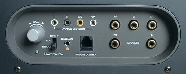 На задней панели сабвуфера имеются также вход для проводного регулятора громкости, отдельный регулятор уровня басов сабвуфера (Bass ±), включатель уменьшения высоких частот (Treble Flat/Reduce).