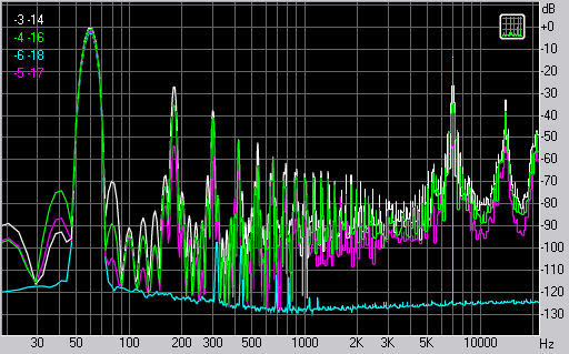 Проследим это на примере стандартного теста IMD-SMPTE. Будем изменять амплитуды синусоид и смотреть на результат. -6/-18, -5/-17, -4/-16, -3/-14 — всё ещё не вызывают клиппинга и имеют пиковый уровень -4.05, -3.05, -2.05, -1.05 дБ соответственно. Максимально громкий сигнал имеет RMS уровень сигнала -4.5 дБ для имитации современной записи. Количество интермодуляционных искажений изменялось от 0,04% до 10%.