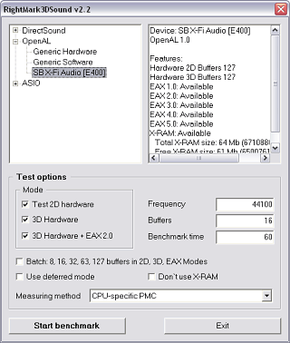 Обладатели X-Fi c X-RAM при желании могут повторить наш эксперимент. Напомню, необходимо перевести X-Fi в Game Mode и выбрать в тесте устройство X-Fi в списке OpenAL устройств системы.