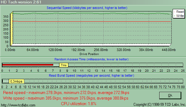 А вот это — результат тестирования карты CompactFlash (для любознательных — это была карта емкостью 512 Мбайт от PQI серии Q6):