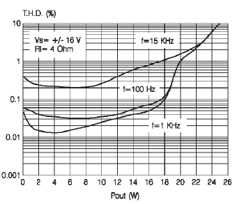 В качестве усилителя производитель использует двухканальную микросхему TDA7265 от STMicroelectronics. Давайте посмотрим на взятые из спецификации графики зависимости THD от мощности: