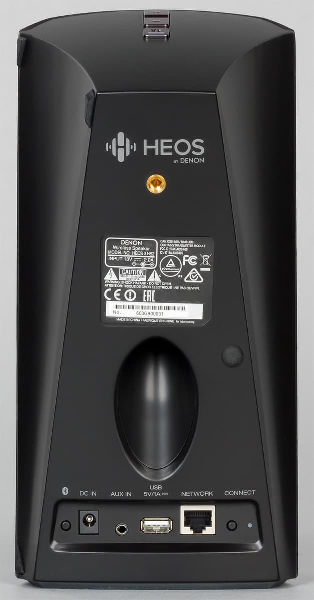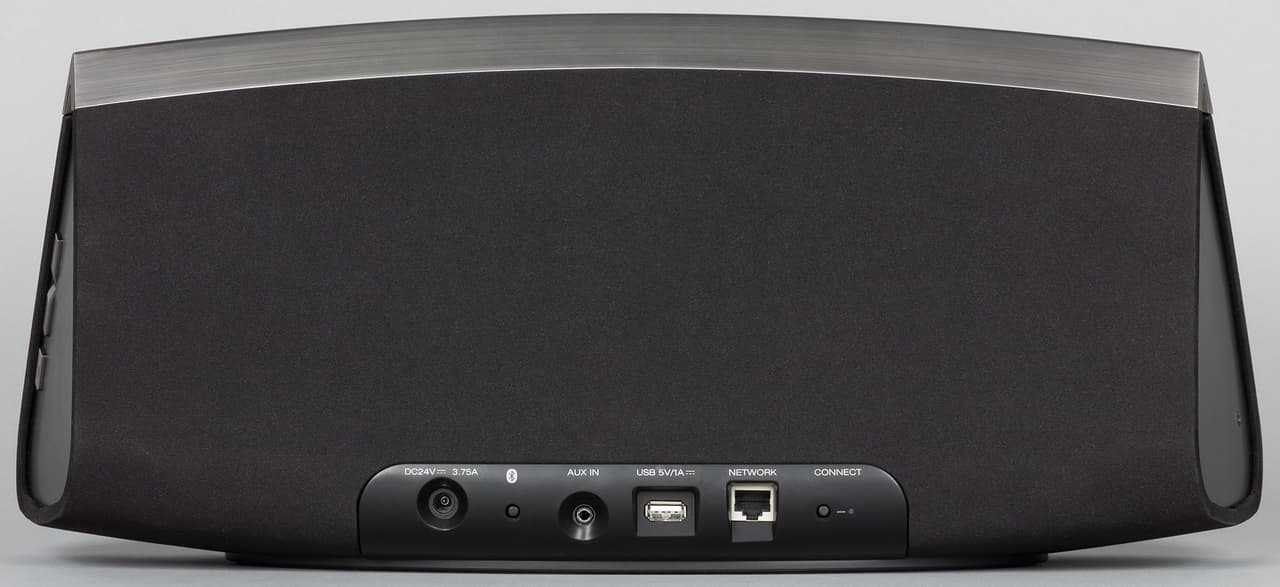 Сзади есть отверстие для настенного крепления, порт USB для накопителей (или зарядки смартфонов) и ниша с остальными портами и органами управления — кнопка подключения по Bluetooth и сброса, вход блока питания, аналоговый аудиовход, сетевой порт, кнопка и индикатор для подключения к Wi-Fi.