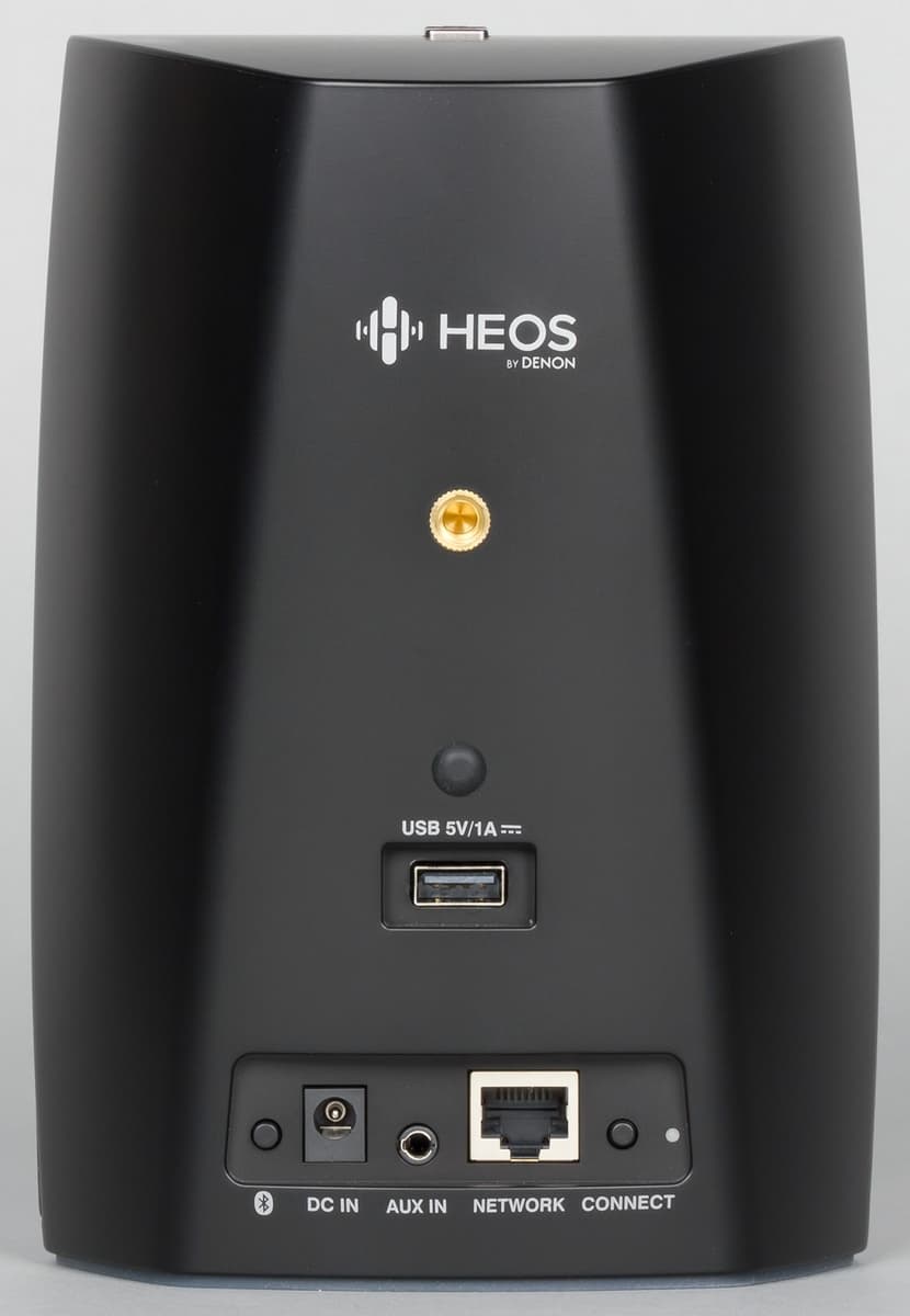 Задняя панель плотно занята разъемами, а также имеет индикатор и пару кнопок. Здесь представлены: вход кабеля питания, вход кабеля локальной сети, кнопка подключения по Bluetooth и сброса настроек, кнопка и индикатор подключения Wi-Fi, порт USB для накопителей, аудиовходы (аналоговый, цифровые коаксиальный и оптический), аудиовыходы (аналоговый стерео и отдельно на сабвуфер, цифровые коаксиальный и оптический), выход на ИК-передатчик, выход триггера управления внешним оборудованием.