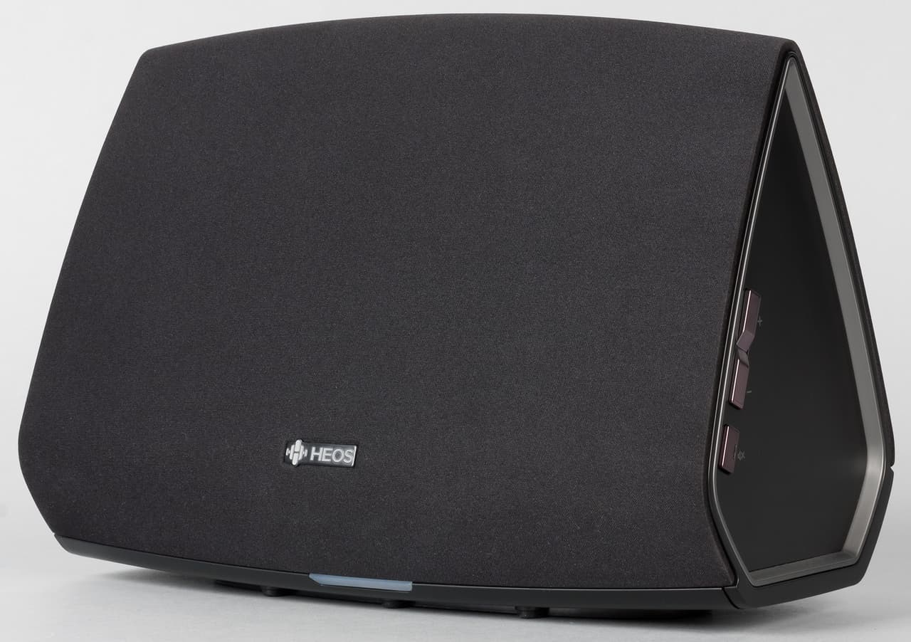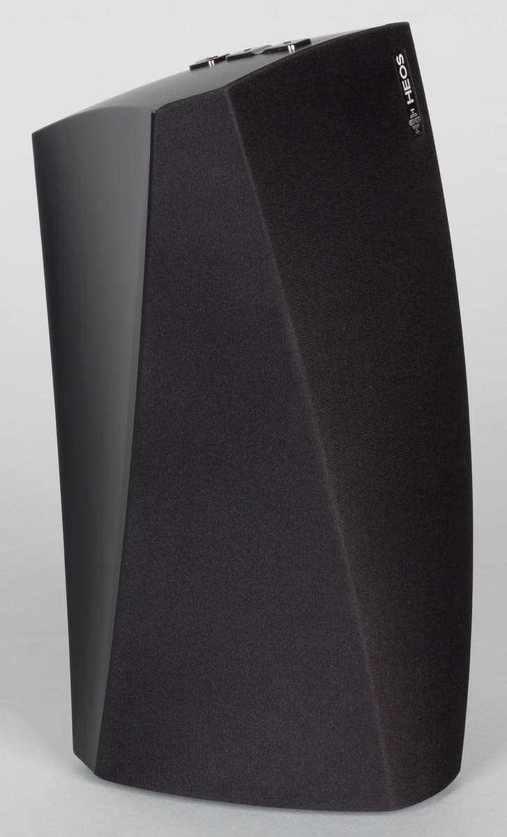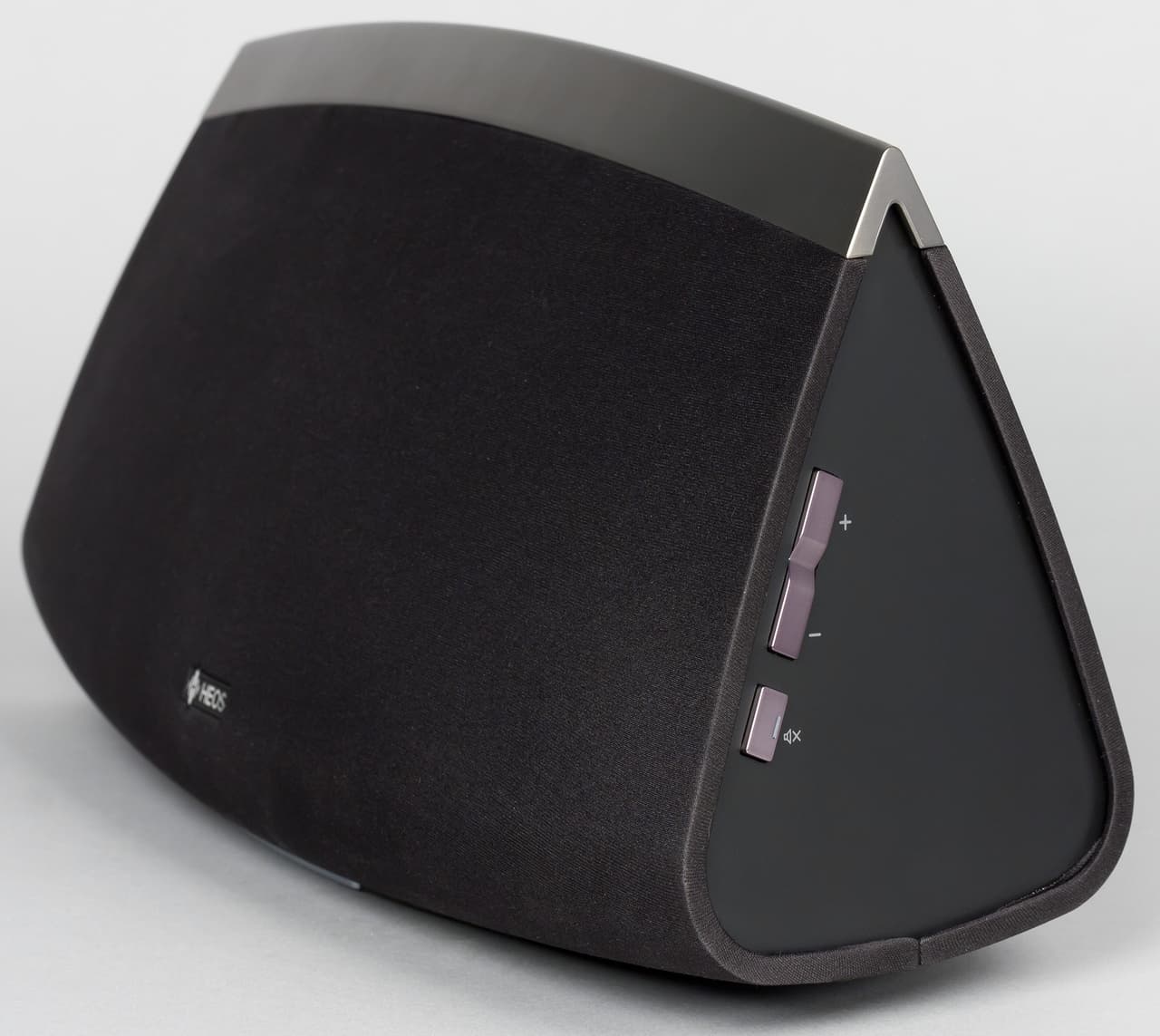 Heos 5 рассчитана уже только на горизонтальную установку. Ее корпус имеет габариты примерно 30×21×17 сантиметров. Форма в проекции близка к треугольнику. Нижняя часть и торцы выполнены из пластика, сверху все закрыто сеткой из ткани.