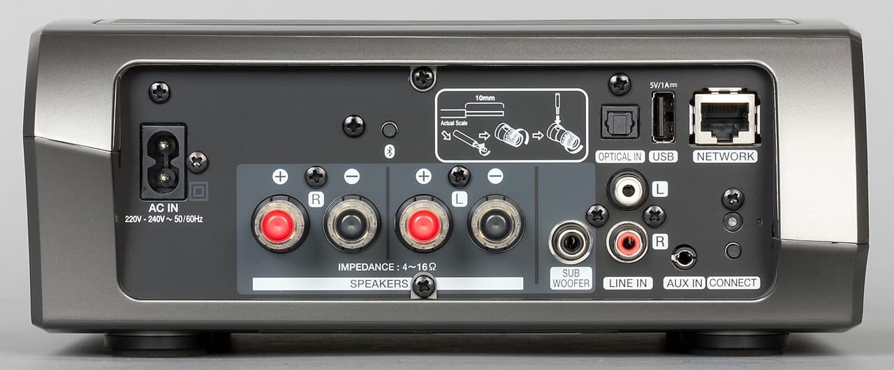 На задней панели находятся все разъемы: вход кабеля питания, кнопка подключения по Bluetooth и сброса, винтовые зажимы для проводов акустических систем (заметим, что для них предусмотрена защита с использованием реле), выход на сабвуфер, три варианта аудиовхода (миниджек, два RCA, оптический цифровой S/PDIF), порт USB, порт для подключения к проводной сети, кнопка и индикатор для подключения к Wi-Fi.