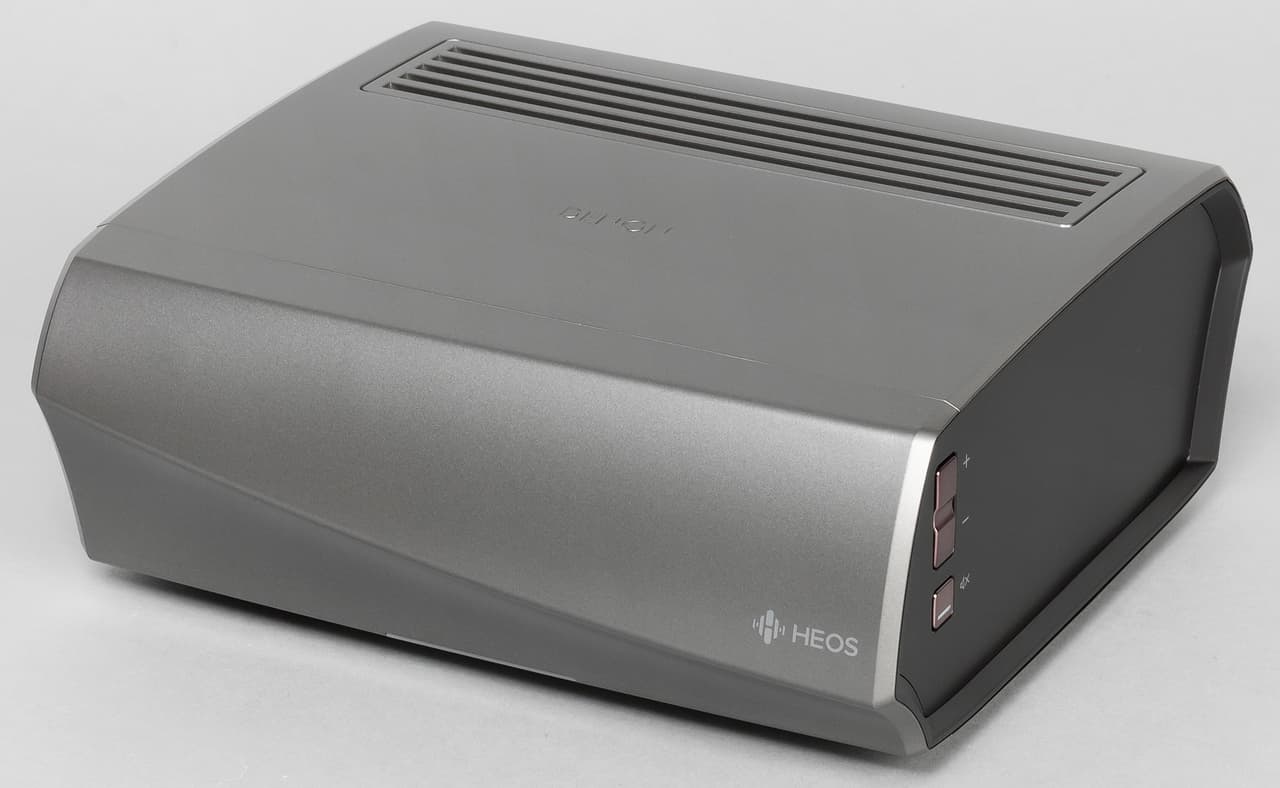 Модель можно считать вариантом Heos Link, но со встроенным усилителем мощности. По внешнему виду Heos Amp тоже похож на это устройство, но более крупного размера. Корпус выполнен из такого же серого пластика. Габаритные размеры составляют около 22×21×9 сантиметров. Верхняя панель не плоская, так что установить что-то еще сверху не получится. Кроме того, на ней есть решетки вентиляции. Спереди внизу на ребре установлен светодиодный индикатор состояния. На правом торце разместились кнопки регулировки громкости и выключения звука.
