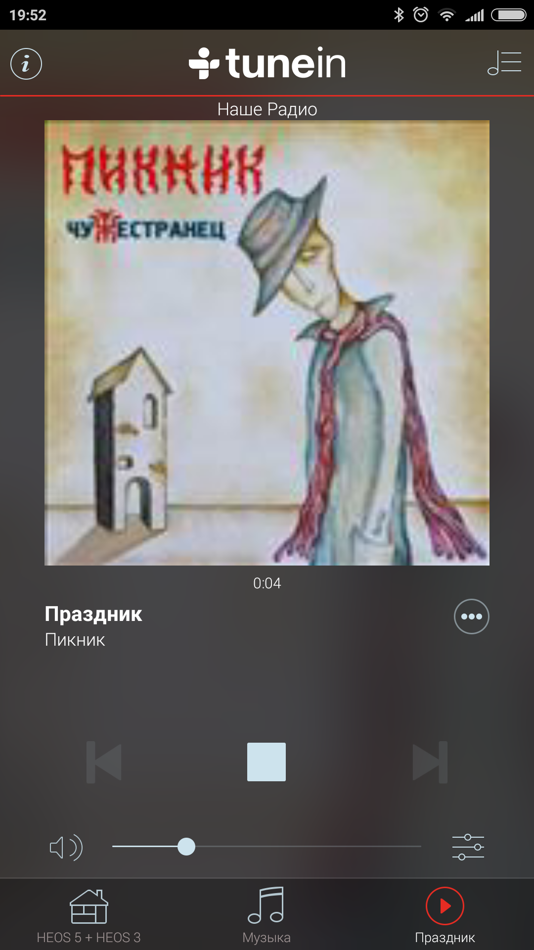 Третья страница аналогична привычным медиаплеерам: в центре — лого трансляции или обложка альбома, а под ней находятся кнопки управления воспроизведением и громкостью. Дополнительно можно выбрать индивидуальные уровни для устройств группы, изменить порядок проигрывания (если речь об альбомах или плейлистах). Значок в правом верхнем углу позволяет добавить поток в избранное, знак в левом верхнем углу — управлять списком воспроизведения.