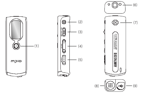 Раскладка плеера изменилась заметно. Как и ранее, на лицевой поверхности находится ЖК-дисплей и всего одна кнопка Play/Stop (1). Сверху плеера исчез «пенек» для крепления «упряжи» — теперь его можно не прикручивать, когда не нужен, а если нужен — для этого есть резьбовое отверстие (7) на задней стороне плеера. На место старого крепежа с боковины переехал разъем для наушников (6), который теперь находится на одной линии с креплением для «ошейника» точно посередине плеера, так что на шее FY200 носить удобнее, чем DMK или любую из компактных моделей конкурентов. Батарейный отсек теперь открывается с торца, и доступ к нему осуществляется на нижней грани плеера (8), рядом расположен USB-разъем, закрывающийся пластмассовой крышкой на длинном «поводке» (9). Все основные органы управления сосредоточены на левом боку плеера: кнопка Rec (2), начинающая запись или переключающая режим А-В, джойстик для навигации по файлам или в меню (3), качелька регулировки громкости (4) и ползунок блокировки кнопок (5). Такое расположение позволило сделать плеер очень плоским, да и удобнее оно, нежели в случае DMK.