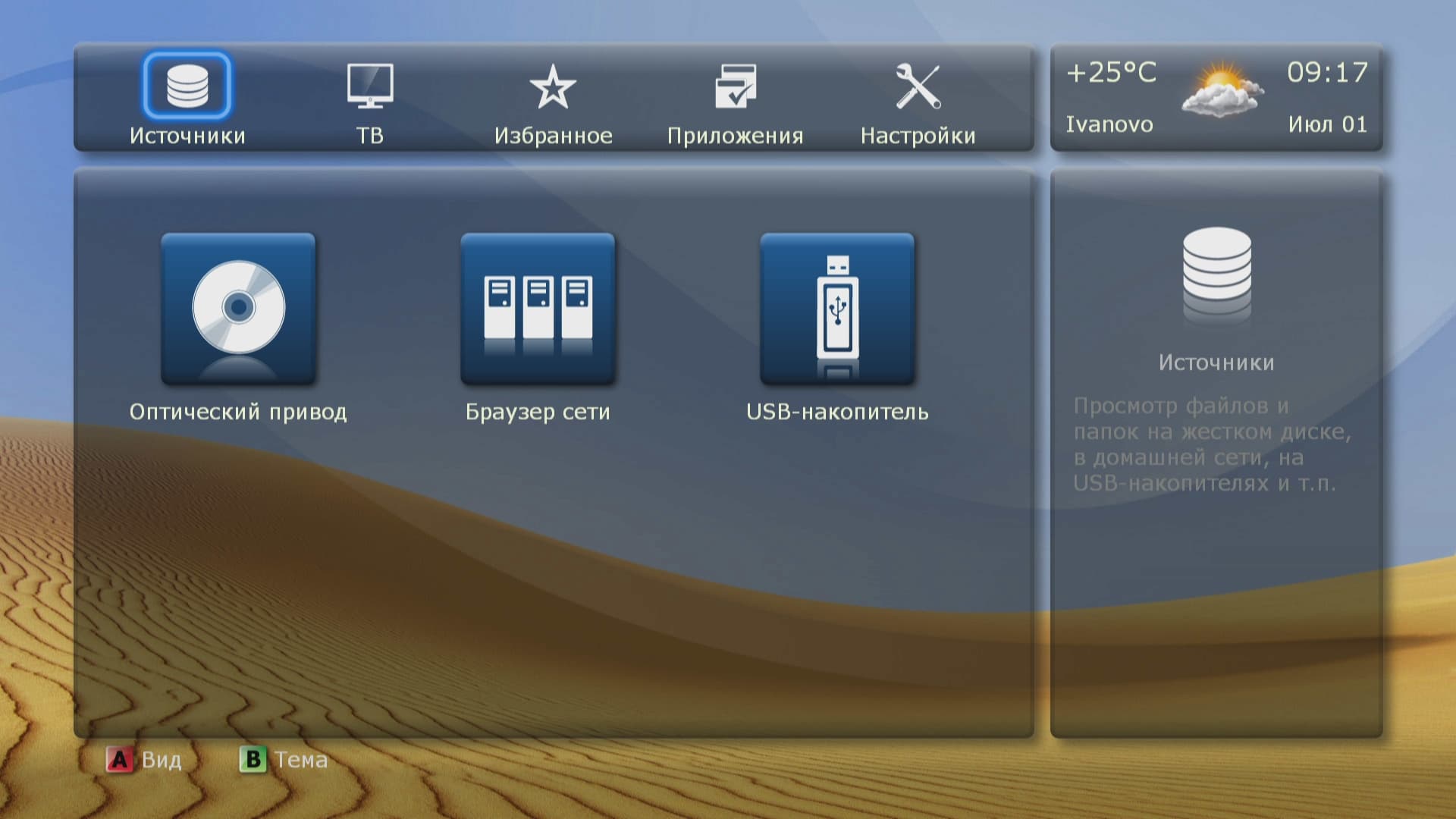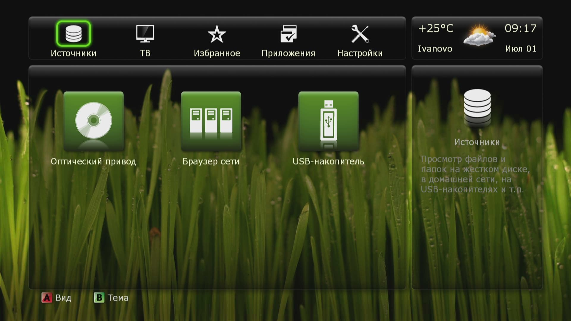 Здесь, как видим, главный браузер разбит на несколько окон, в двух из них осуществляется выбор носителя и контента, в третьем отображается текущее время и погода, а чётвёртое информационное окно содержит сведения о выбранном элементе. Внизу экрана можно наблюдать подсказку из двух пунктов. Она гласит о том, что в данной версии прошивки задействованы цветные кнопки, имеющиеся на ИК-пульте, обозначенные латинскими буквами A, B, C и D. Этими кнопками пользователь может на лету изменить способ отображения содержимого окна файлового браузера (иконки, список), а также изменить цветовую тему оформления на любую из восьми имеющихся. Перезагрузка после этого не требуется, все изменения происходят за считанные секунды.