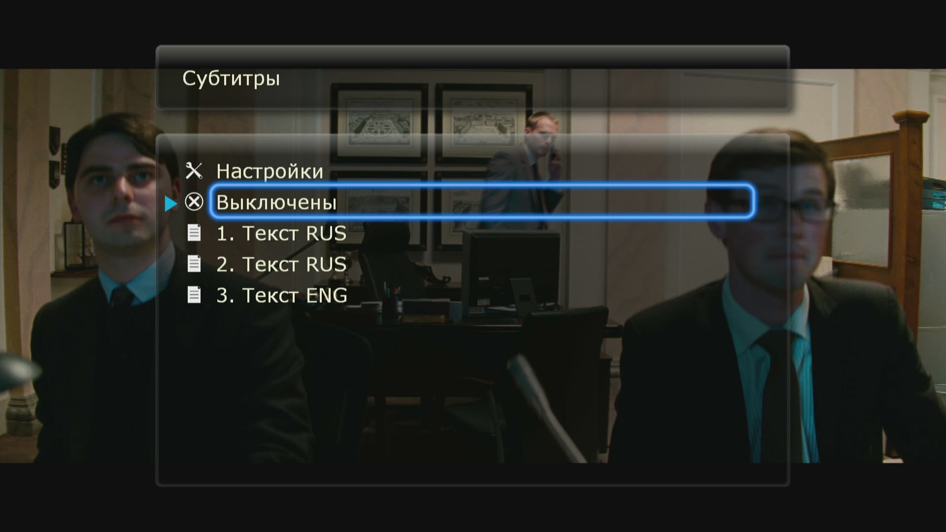 Ускоренный просмотр доступен в обоих направлениях вплоть до значений 32х, также возможно замедленное воспроизведение до 1/32х. Выбор субтитров и их настройки, а также выбор звуковой дорожки осуществляется нажатием соответствующих клавиш на пульте ДУ с последующим выбором нужного пункта из всплывающих меню.