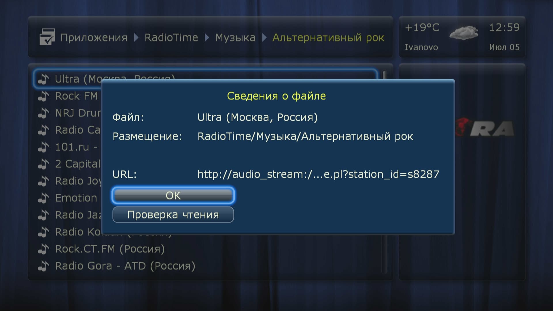 Следующий сервис — RadioTime — это онлайновая библиотека музыкальных каналов, разбитая на категории и станции. Перед воспроизведением выбранной станции пользователь может проверить её доступность в настоящий момент, нажав Проверка чтения в окне информации.