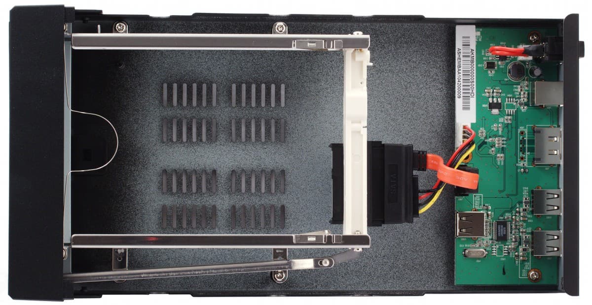 Конструкция модуля совсем простая — рек для винчестера и управляющая плата контроллера. Она совсем небольшая и расположена в задней части корпуса. Основной чип адаптера SATA/eSATA/USB — Inito INIC-1611L, также на плате можно найти и USB-хаб GL850G. Благодаря ему обеспечивается реализация трех дополнительных портов USB.