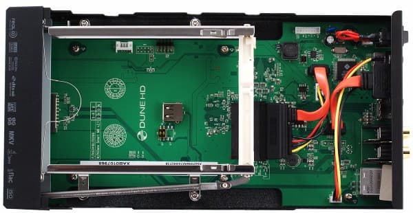 Подключение к основному плееру можно реализовать двумя способами — через интерфейсы eSATA или USB 2.0. Во втором случае обеспечивается и поддержка двух внешних дополнительных портов USB, и одного внутреннего. Заметим, что внутренний недоступен пользователю без открытия корпуса, что сопряжено с нарушением гарантии.