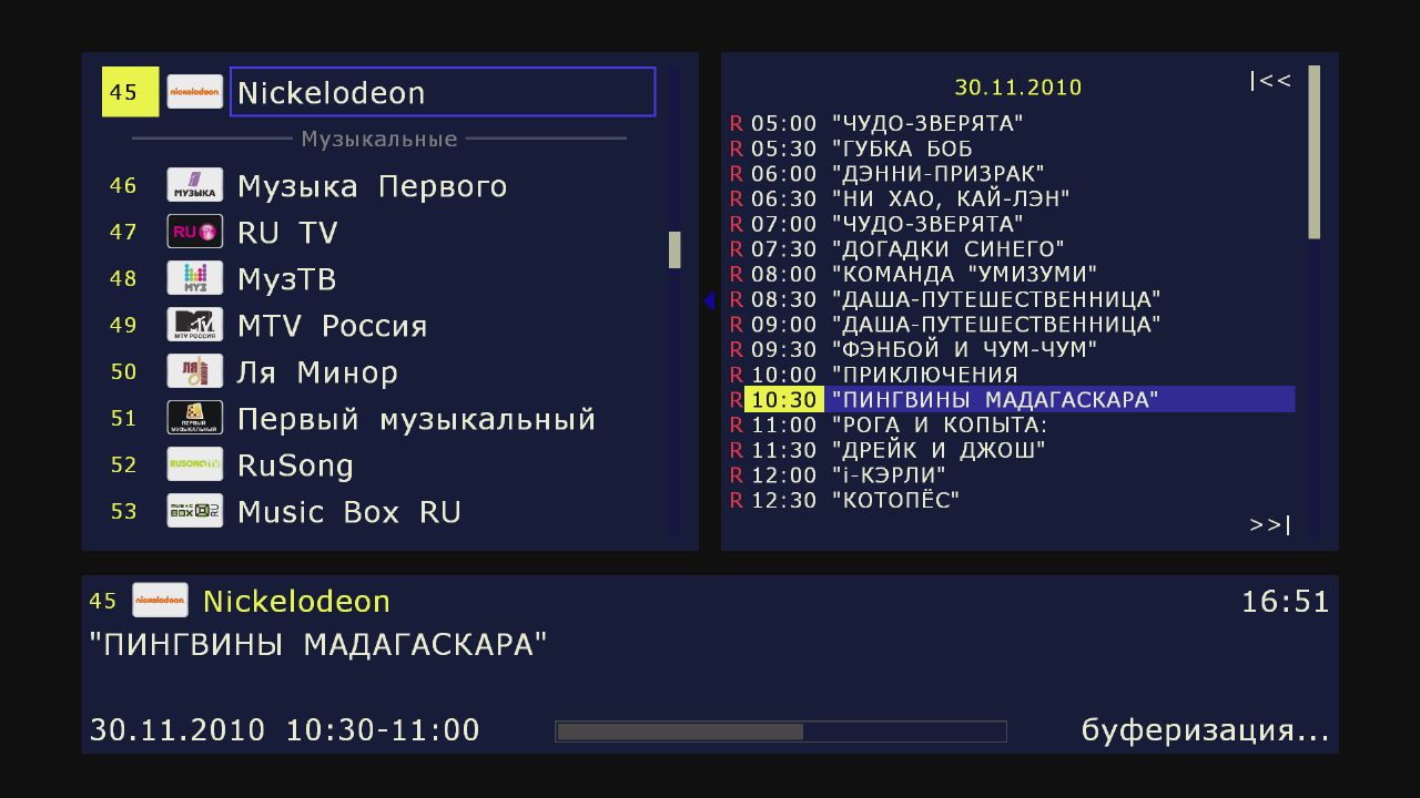 Так что если вы вдруг пропустили что-то, то можно легко к этому вернуться в любое время и посмотреть полностью. Причем не один раз, а сколько захочется. Эта возможность в некотором смысле компенсирует отсутствие в текущей версии клиента записи по расписанию. Однако «ручной» режим остается — в любой момент просмотра передачи вы можете нажать кнопку «Rec» и записать ее на жесткий диск плеера или любое локально подключенное устройство хранения.