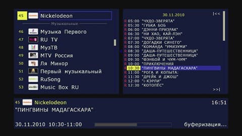 Переключать каналы можно присутствующими на пульте кнопками P+ и P-. Кнопка Info вызывает на экран информацию о передаче — название, время трансляции, краткое описание (если эти данные были предоставлены каналом). Для быстрого выбора каналов можно использовать меню, которое открывается по кнопке PopUp. В нем есть список всех категорий, каналов, программа телепередач. В последней можно заметить знак в виде красной букву «R», за которым скрывается возможность просмотра уже прошедших передач в записи. Причем сервис предоставляет «обратный отсчет» за две последние недели.