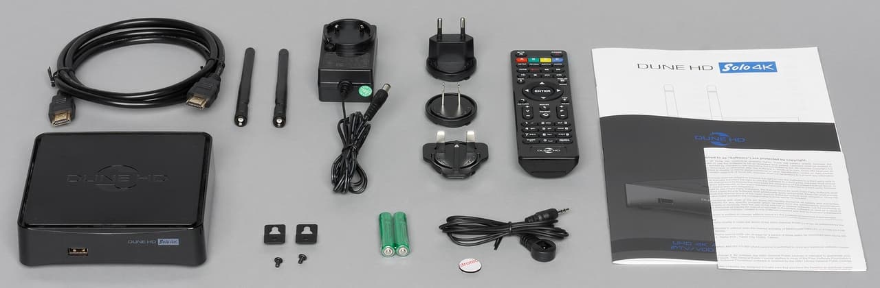 Внутри на «верхнем этаже» под руководством пользователя (на английском языке) и инструкцией по подключению (на нескольких языках, включая русский) в специальной вставке находится сам плеер. Под ним в одной большой куче собраны остальные элементы комплекта поставки: внешний блок питания (12 В 1,5 А) со сменными вилками под разные типы розеток, пульт дистанционного управления и пара батареек формата ААА для него, две съемные антенны Wi-Fi, полутораметровый кабель HDMI, специальный кабель для вывода аналогового видео и звука, выносной ИК-приемник для пульта ДУ с кабелем, кронштейны для настенного крепления.