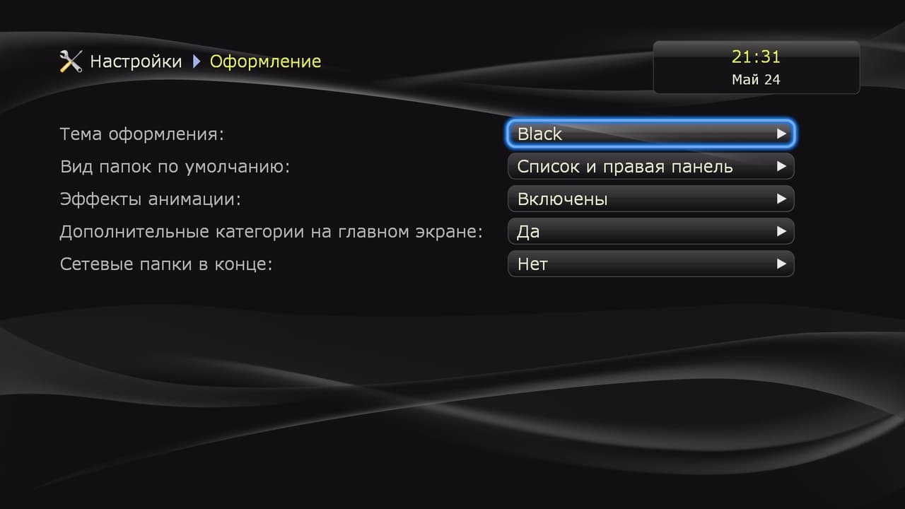 Плеер, как и его предшественники, имеет широкие возможности по изменению внешнего вида интерфейса. В группе параметров «Оформление» можно, в частности, установить желаемую тему, выбрать вид списков папок, выключить анимацию. Так что если вы уже используете плееры этого производителя, можно легко сделать дизайн интерфейса одинаковым.
