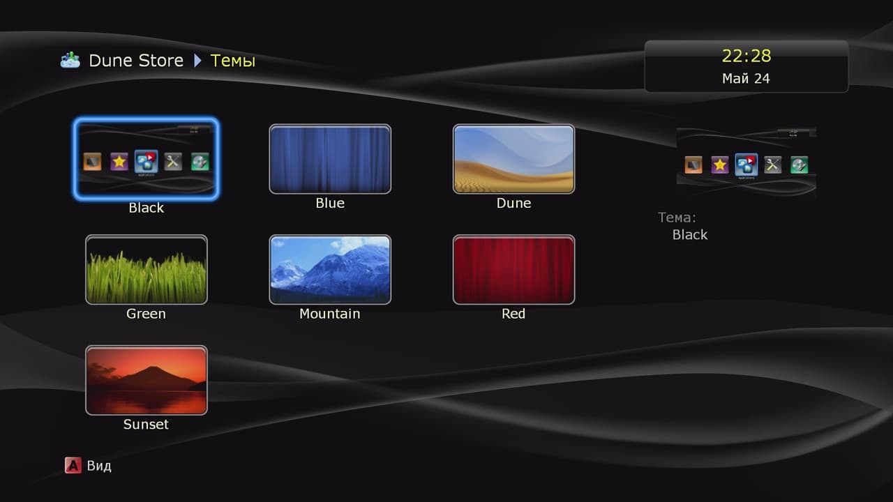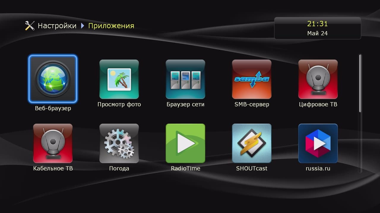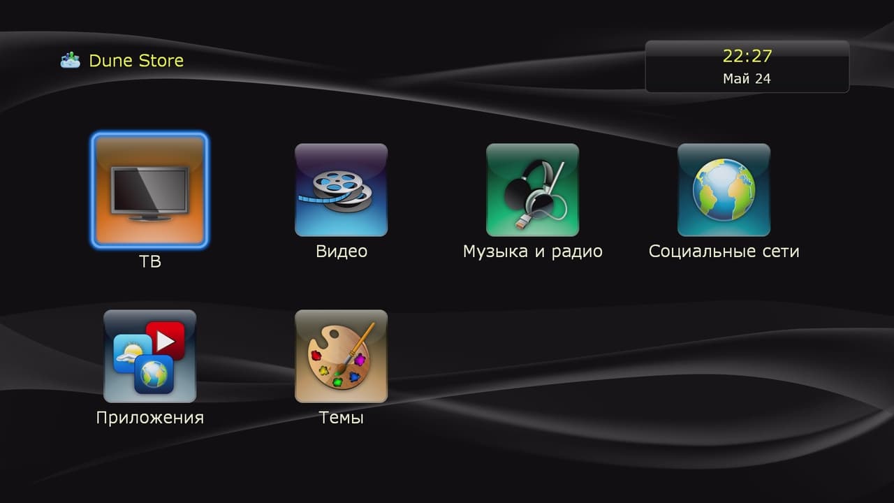 На устройства данного производителя можно устанавливать дополнительные приложения, что существенно расширяет их возможности. Некоторые модули интегрированы в прошивку, а другие могут быть загружены из официального каталога Dune Store или с сайтов сторонних разработчиков. При этом программы способны интегрироваться в систему, включая создание собственных страниц настроек в штатном интерфейсе. Также в группе «Приложения» вы можете отключить неиспользуемые значки для более простой навигации на главном экране.