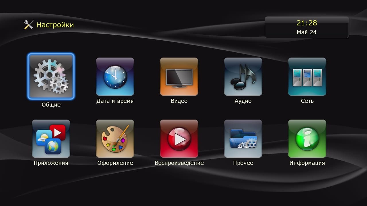 Сначала пройдемся по штатным настройкам плеера. Всего на соответствующей странице интерфейса представлено десять значков. В «Общие» можно поменять язык интерфейса, установить таймаут для включения экранной заставки, а также осуществить сброс настроек. Плеер умеет синхронизировать время через интернет, так что обычно достаточно только выбрать часовой пояс и при необходимости включить переход на летнее время.
