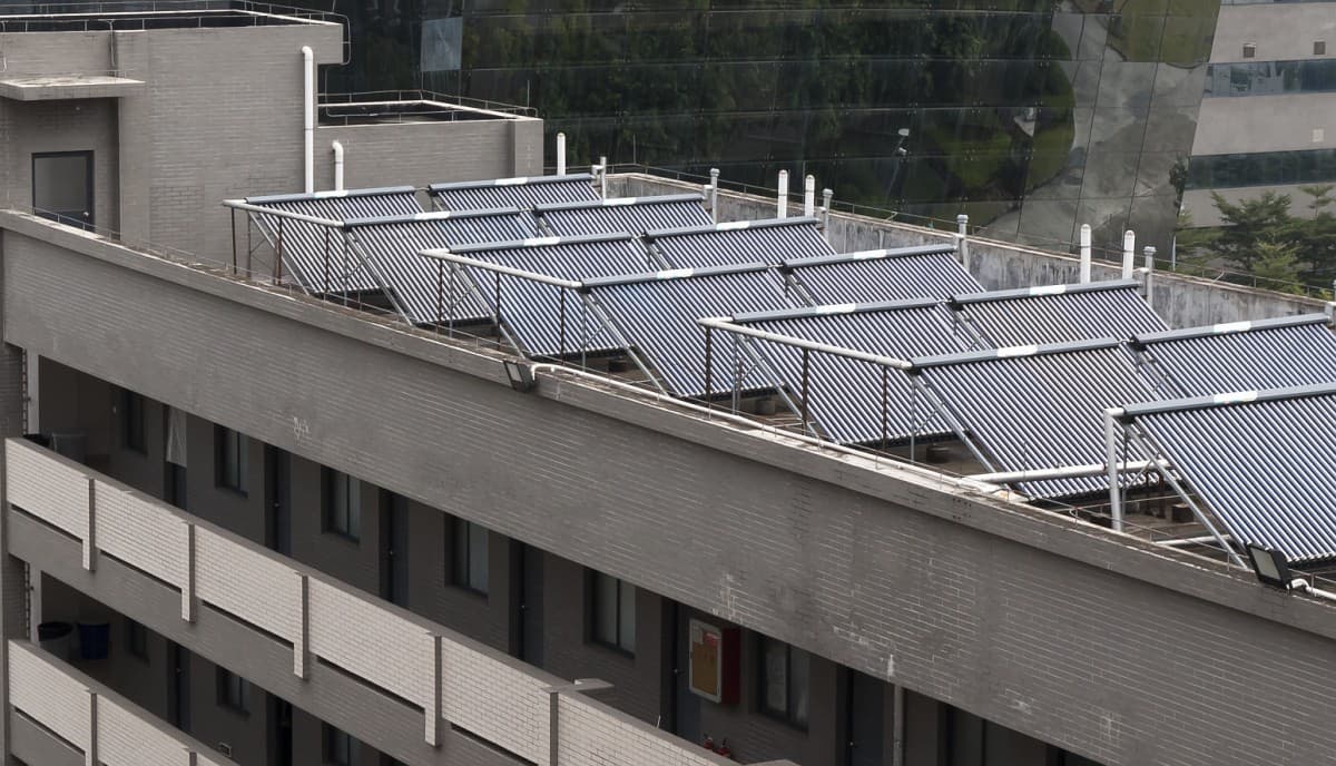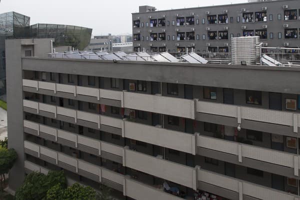 Кстати, на крышах зданий общежитий расположены ряды с солнечными элементами, нагревающими воду для нужд производства — для обогрева.
