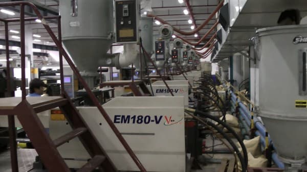 А это цех, где происходит выдувание различных пластиковых элементов, включая копуса для колоночек. Линия по производству насчитывает 80 машин, которые работают постоянно, без остановки. Дело в том, что пластик находится в жидком состоянии, и если остановить производство, чтобы сменить болванку, то остывшую машину приходится выбрасывать.