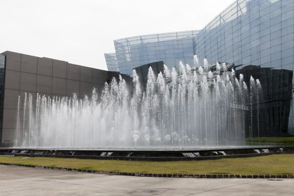 Фасад офисного здания выполнен из стекла, а перед ним сооружен огромный фонтан, который ночью еще и подсвечивается разными цветами и работает в такт под музыку. Выглядит это очень красиво.